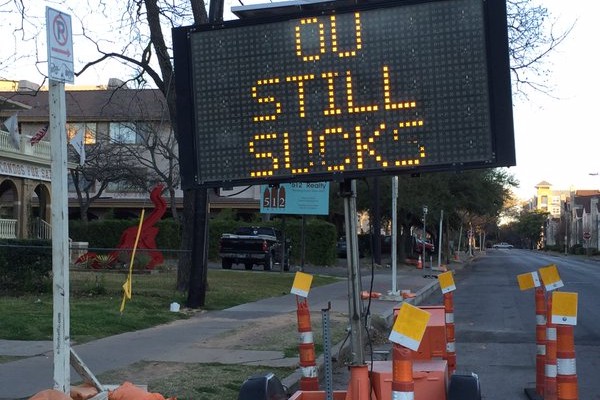 Traffic sign hackers on Rio Grande and 24th Street say ‘OU Still Sucks’ https://t.co/fCqwLr23j0 pic.twitter.com/xzfxm4Pf9i